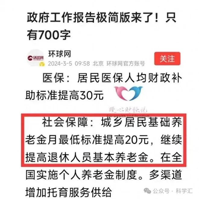今年的政府工作报告中明确,我们要提升城乡居民养老保险基础养老金最低标准20元(去年是提升5元),继续提高退休人员基本养老金(去年是增长3.8%)。
