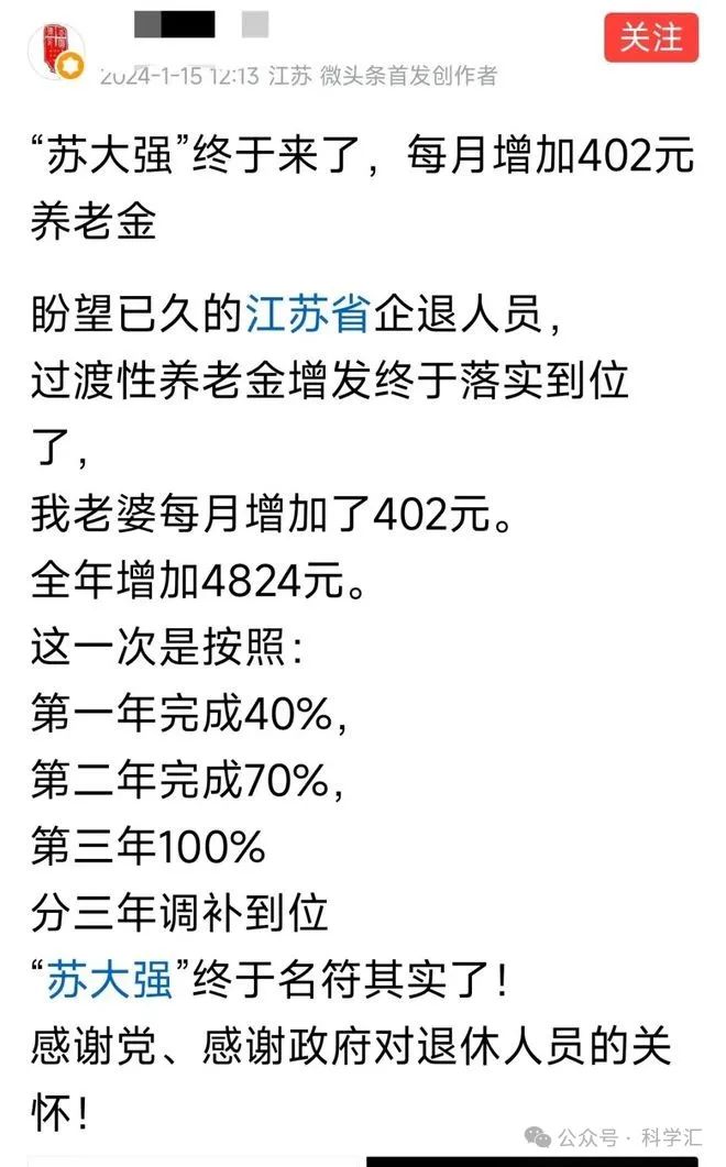 第一,江苏省的过渡性养老金待遇提升人员。2024年1月,江苏省改革了过渡性养老金计算方法。对于之前退休的人员也按照就高不就低的原则,允许套用重算养老金。部分老人1月份发到手的养老金大大增加,下面这位退休人员的妻子每月增加了402元呢。这次的养老金重算,明年和后年还会再次增加的。