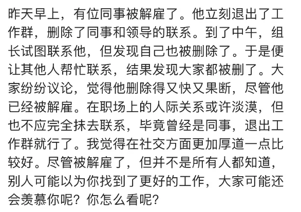 今天聊起的一位同事,因为公司的重组,不得不离开公司。他的动作很快,几乎是在收到通知的同时,他就退出了工作群,删除了所有的联系方式。到了中午,当组长想联系他,确认一些工作交接事宜时,却发现自己已经不在对方的联系人列表里了。这样的决绝,让整个都感到了一丝错愕。