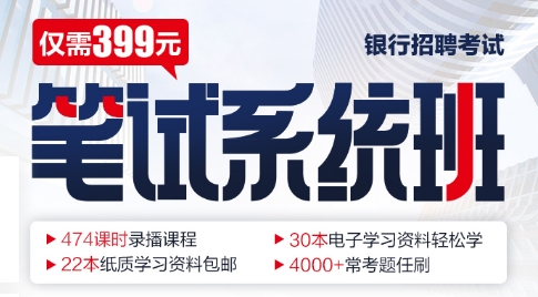 银行深度系统班,适用200家银行招聘考试,474课时视频课程,5大复习阶段科学规划,包含22本纸质讲义+30本电子讲义,4000题库任刷,仅399元,点击下方立即报名!