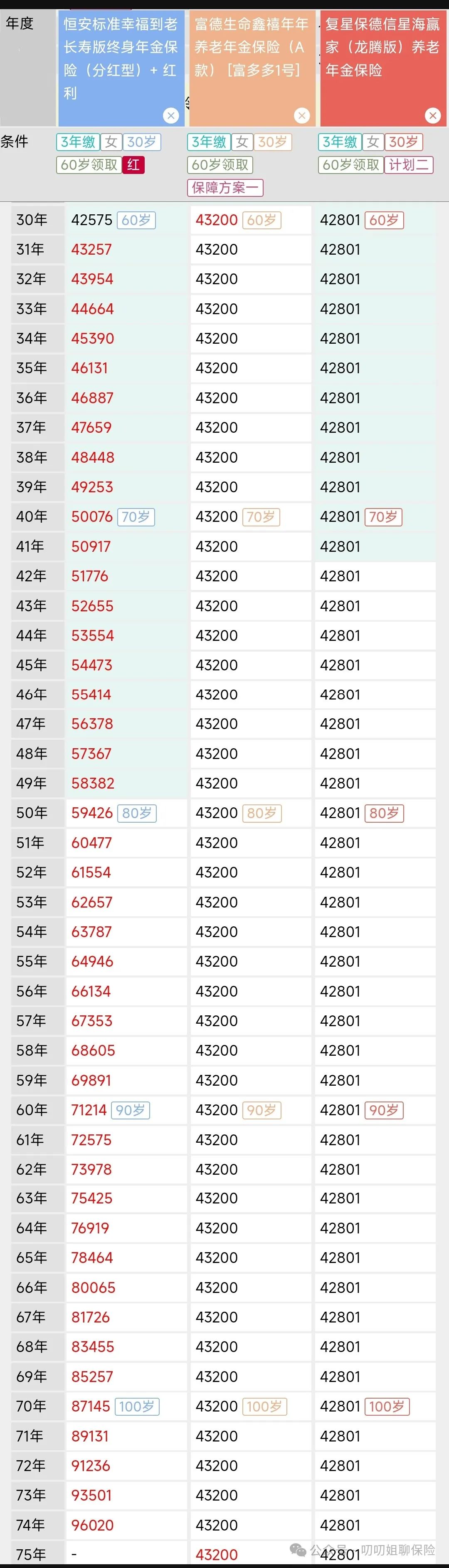 PS:由于幸福到老长寿版的缴费期比较特殊:3/6/8/12年,其中仅有3年交与其他养老金重合,因此以下只对比了3年交的情况;