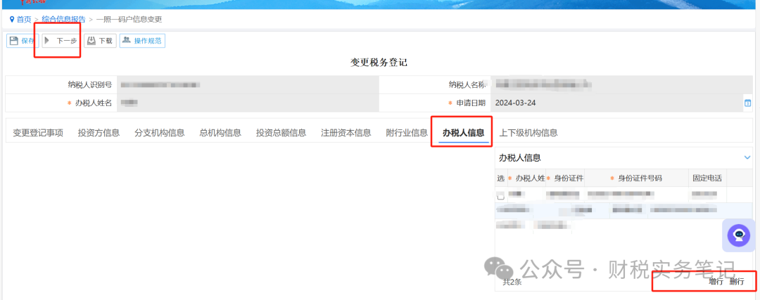 第二步:点击办税人信息,通过增行与删行来添加或删除办税人信息。如果是新增需要填写办税人姓名、身份证号、手机号等信息,点击下一步根据提示保存即可。提示:如果是新增办税人,需要该办税人先进行电子税务局实名认证后才可以通过。