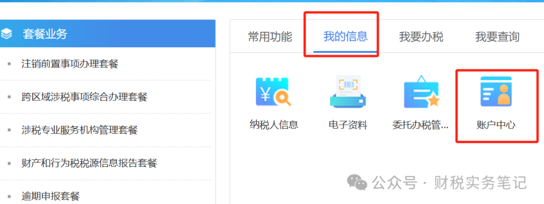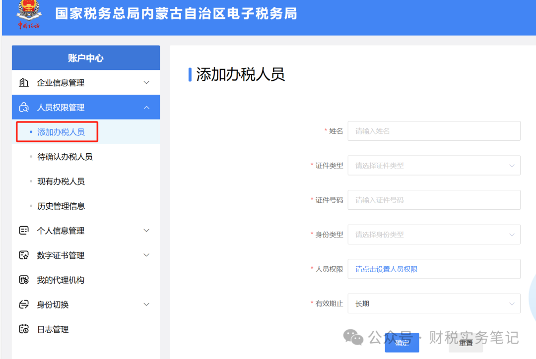 点击我的信息→账户中心→人员权限管理,添加办税人信息可以设置人员权限。
