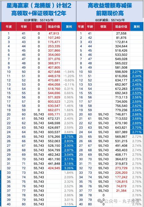 因此,许多领取高的产品,如大家养老慧选B、长城人寿明爱金彩等高领取的计划,都是一旦领取,现价为0(比如60岁开始领取,61岁退保一分钱也退不了,只能拿回本金)。然而,龙腾版计划二直到72岁依然有现金价值,并且在72岁时的节点,irr也是全市场最高水平。相当于给了一个机会,72岁时,如果觉得自己健康不太ok,那就退保取现金价值,所以比较灵活,相对进退自如。