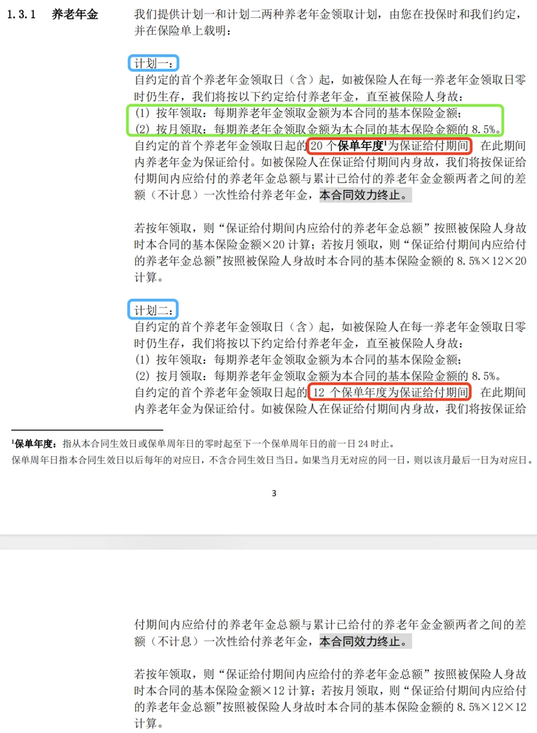 当然它也有它的不足之处, 我在最后的部分详细提到。2、两种方案,计划一(保证领取20年)和计划二(保证领取12年)。开始领钱之前,这两种方案可自由切换。PS:什么叫保证领取N年,就是活着肯定能领够N年,超过N年,依然可以继续领。万一领了一半,人噶了,没领完的那几年会一次性给到你的家人,所以这里叫“保证领取”。3、可附加万能账户,保底2%,现行利率3%-4%左右。年保费≥2万,全家人可享受电话问诊、挂专家号(可指定医生,市场独一家哦)等服务;