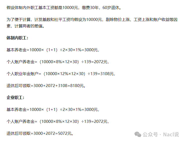 体制内的收入虽然不能和企业白领、高管相媲美,但退休后的养老金足以让这些企业里的员工“羡慕到妒忌”,同样大家都是打工的,甚至工作强度更大,可退休后,领起退休金来却差了好多。  然而十年前的一项“养老金并轨”改革,将在半年后正式启动,体制内还会是大家手里的“香饽饽”吗?2014年10月,国J推出“体制内单位和企业养老金并轨”这一政策,标志着养老金并轨改革的正式启动。之后,体制内职工开始缴纳社会保险费用,建立与企业职工一致的养老制度。那么,改革之前呢?改革前,体制内单位与企业养老金实行双轨制,待遇差异显著。我国自20世纪90年代初开始构建多层次的养老保险体系,企业职工养老保险制度实行社会统筹与个人账户相结合,由企业和个人共同承担费用。 然而,由于当时经济状况和财政收入的限制,体制内人员采用了不同的养老方式,即机关事业单位养老保险,无需个人缴费,养老金由国家财政负担,计发方式依据工作年限有所不同。与此同时,许多企业并未严格执行养老保险制度,导致企业职工社保缴纳不足,进一步加剧了体制内外养老金的差异。在当时社会年轻化的背景下,养老问题并未引起广泛重视,许多人甚至对社保缴纳持不重视、消极态度。在经过了三十多年的时间发酵后,体制内外养老金差异显著。同样工龄,体制内外退休后养老金快差出了两倍。显然,为了确保社会公平和共同富裕,养老金改革势在必行。为确保改革的平稳过渡,由此设置了10年过渡期,至2024年完成并轨。很多人会说,这不已经2024年了,为什么感觉不到差距的缩小?其实,养老金“并轨”对不同年龄段群体的影响是不同的,说直白一点就是,早出生的人受影响小,晚出生的人受影响大,即对年轻人来说改变最大。这不过去的十年里,实行“老人老办法、中人中办法、新人新办法”的计发原则。直到2024年10月后,体制内单位和企业养老金正式完成并轨,完全按照新办法计发养老金,旨在实现养老金制度的公平与可持续。 对于已经退休的“老人”来说,“养老金并轨”政策的影响相对较小,他们的养老金待遇已经确定。对于即将退休的“新人”来说,影响则相对较大。他们的养老金计算将基于新的制度,可能需要进行重新计算和调整。体制内的职工就会因此受到和过去不同的“待遇”。而对于处于过渡阶段的“中人”来说,情况看似变得复杂,但总体呈“稳赚不赔”的状态。他们的养老金待遇将采用新老待遇计发办法对比,保低限高。这种过渡性的安排旨在照顾这部分人群的利益,避免因为改革而出现待遇的大幅下降。由于缴费方式和计算公式的统一,养老金待遇水平将更加公平。并轨后,社保基金收入增加,有助于增强基金可持续性。而且财政负担将逐渐由直接承担退休费转向支持社保制度建设。但实际待遇仍受缴费水平、缴费年限以及单位年金等因素的影响,体制内职工与企业职工间仍存在差异。这其中最大的影响因素--职业年金也造成了体制内外养老金仍旧无法简单地划等号的原因。尤其是短期内,养老金并轨政策对体制内职工的影响有限。体制内职工每月需缴纳工资的4%作为职业年金,单位则缴纳8%,这些资金将进入职工的个人职业年金账户。加上基本养老保险个人账户的8%,体制内职工的个人账户总额相当于达到了20%,远高于企业职工个人账户的8%。尽管一些企业也提供企业年金,但享有此福利的员工占比不到10%,而体制内职工则全面覆盖。