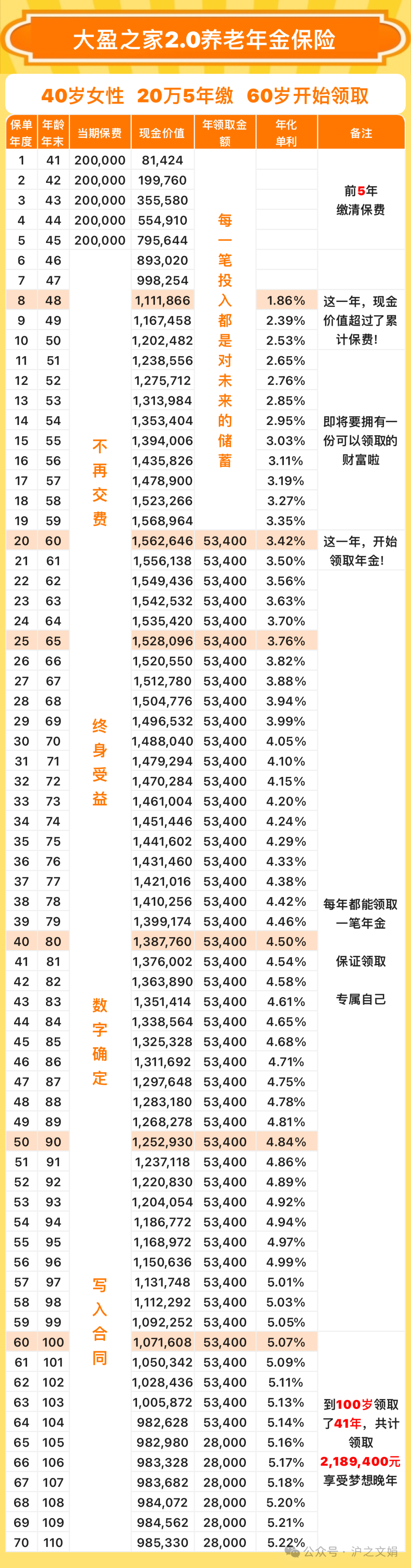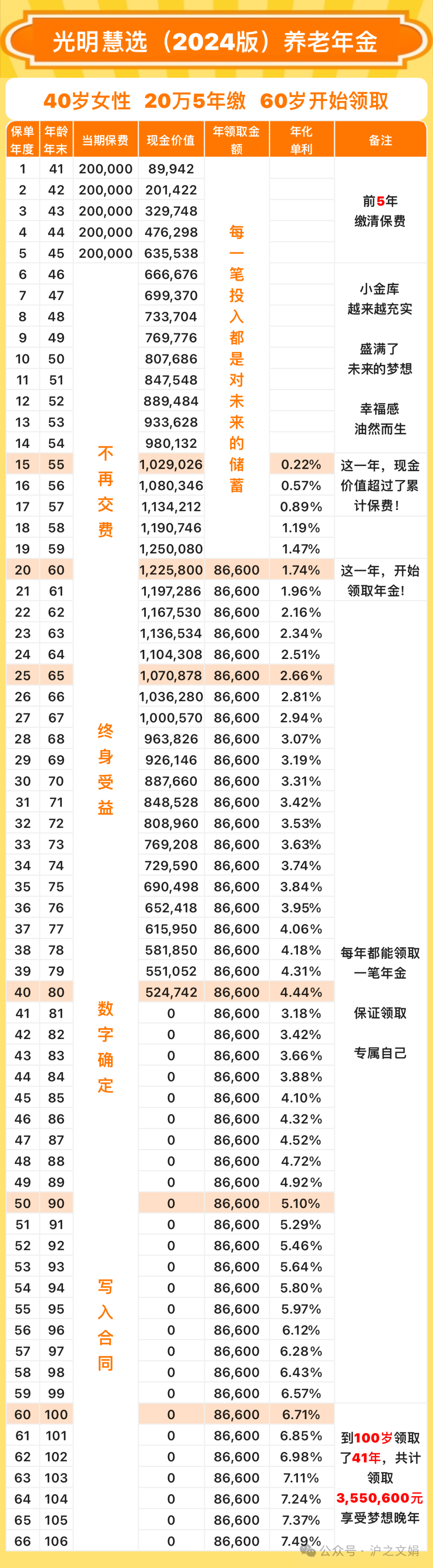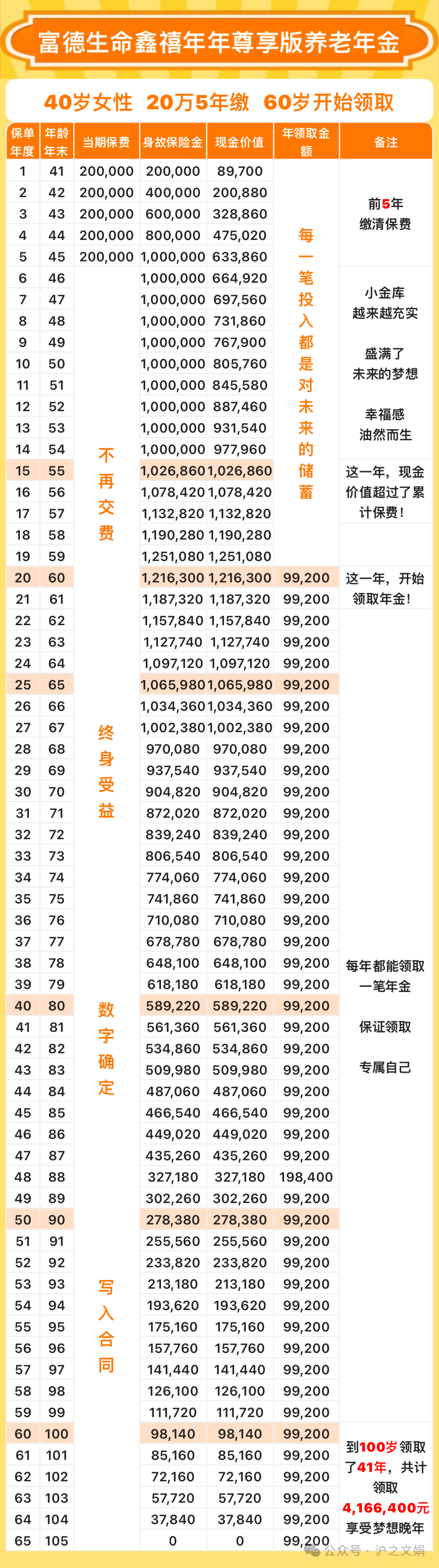 本公众号第115篇原创文章 最近几年,人口老龄化、少子化的趋势越来越明显,国家也采取了各种措施来应对这种趋势,自然而然,为自己的养老早做准备的人也越来越多。从业四年以来,看了近百款商业养老金产品,总结了一下,大体分为以下四种类型,每一种类型,适应于不同观念和想法的人。为能更好的说明问题,我们以40岁女性,20万*5年缴费,60岁领取为例,探讨不同的产品类型,具体领取多少,以及还将有怎样的、除了领取金额以外的权益。这一类产品的特点是:同等条件下,领取最多。按上述40岁小姐姐的例子,每月可领取103736元。如果60岁开始领,刚刚领取没多久就身故了,那么保险公司将未领完的钱(总保费-已领取金额)给到被保险人的身故受益人。如果领取的金额超过总保费后身故,那么就没有任何身故金可以领取。 2、考虑自己的同时,兼顾一下受益人,保证领取20年,且领取之日起20年内可退这一类产品的特点是:同等条件下,领取较多,且开始领取后20年内可退。有的投保人觉得第1类产品中,如果被保人走得早,可能不太划算,那么就诞生了第二类产品,这一类产品在人的一生中,又分了三种情况:第一种情况 ,如果开始领取没多久,被保险人就身故了,那么保险公司就将开始领取之日起,20年内未领取的金额作为身故金赔给被保险人的身故受益人;第二种情况,如果开始领取十几年,被保险人被医生告知,剩下时间不多了,那么可以向保险公司提出退保,也可以退回来一大笔钱。第三种情况,开始领取20年之后身故了,就得不到保险公司的任何赔偿了。假设在领取的第17年想要退保,是可以退到65.24万的,在80岁之后如果身故,就不会有任何赔偿了。 3、开始领取后终身可退,且可退金额越来越少,至105岁降为0这一类产品和第2类有点类似,不同的是,在开始领取之后,直至105岁,随时可以退保,且能够退回的钱随着时间的推移,越来越少。特别是有些老人觉得不想保了,想一次性拿回来一笔比较多的钱,可能选择在任何一个时点退保。按上述40岁小姐姐的案例,这一类产品,每月可领取的金额为8432元。如果选择在78岁退保,可以退回64.81万元。 这一类产品的特点是:开始领取后,无论什么时候选择退保,总保费一直都在(无论是随时退保,还是领取身故金,总保费一直都在),每年领取的,仅仅只是这份保单的孳息,这种类型的产品具有强传承性质,主要是为了将总保费传承给想给的人,在这个过程中,自己领取一定的孳息。