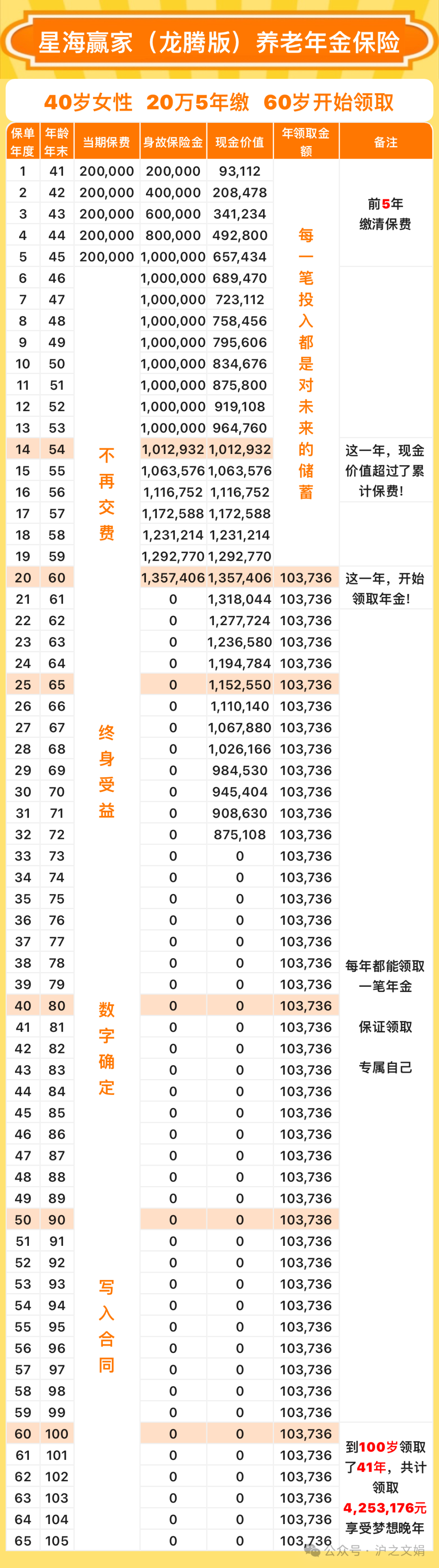 总 结 从上述四个类型的典型产品来看,同样是40岁小姐姐,20万*5年缴费,60岁领取,领取最多的是复星保德信-星海赢家(龙腾版):103736元,最少的是大家养老-大盈之家2.0:53400元,利益中间档的两个产品分别领取99200元和86600元。不是领取得多就是好,也不是领得少就不好,因为风险不知道什么时候来临,也不知道一个人的预期寿命是多少。但我们可以确定的,是我们自己的想法:我们买养老金要不要给其他人留钱,要不要获得一些增值服务(上述四类产品,部分公司有较好的增值服务),配置养老金,要不要消耗我的“总保费”(有的人就是喜欢总保费不动,拿纯收益的产品)。因此,我们在配置养老金前,先要问清楚自己上述三个问题:要不要给他人留钱、是否需要健康就医相关的增值服务、是否希望总保费被慢慢消耗掉。想清楚了这几个问题,便更能贴心地挑选到一款称心如意的养老金产品。