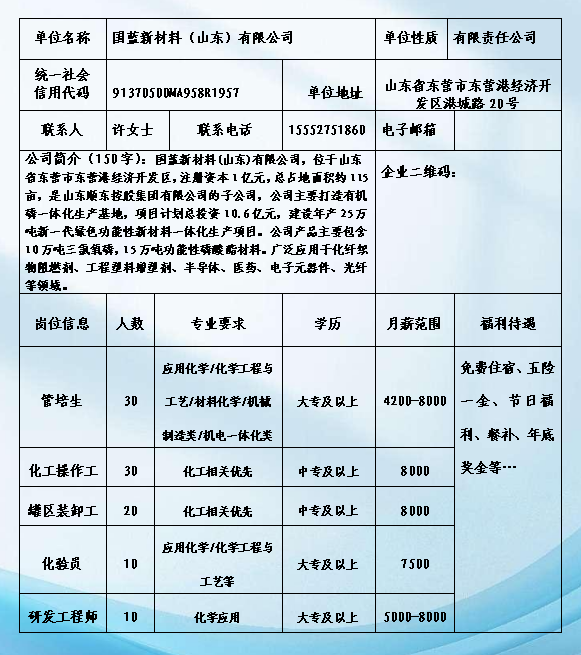 河口招聘:五险一金,免费住宿,餐补,节日福利等!国蓝新材料(山东)有限公司招聘