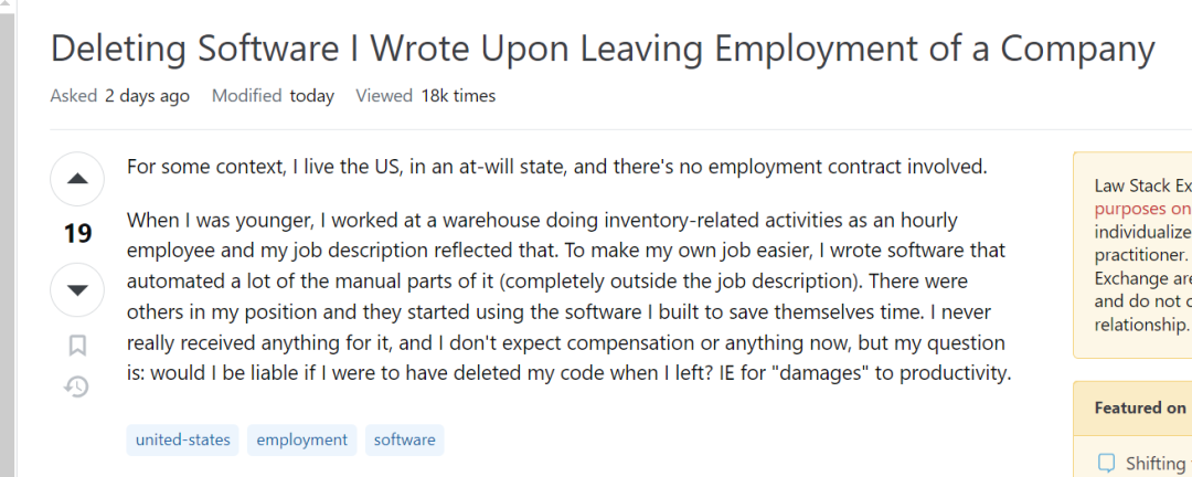 一名开发者近日在 StackExchange 问答社区的 “法律” 板块发布了一个求助帖,咨询 “如果在从公司离职时,删除了自己所编写的软件” 是否要承担相关的责任。