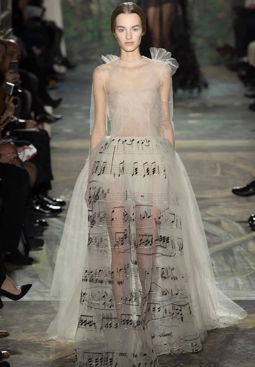 与此同时,两人还创作了许多“仙女裙”,其中最为著名的当属Valentino 2014春夏高定秀上发布的那条乐谱高定裙,用刺绣的方式在透视薄纱裙摆上展示着歌剧《茶花女》的五线谱。