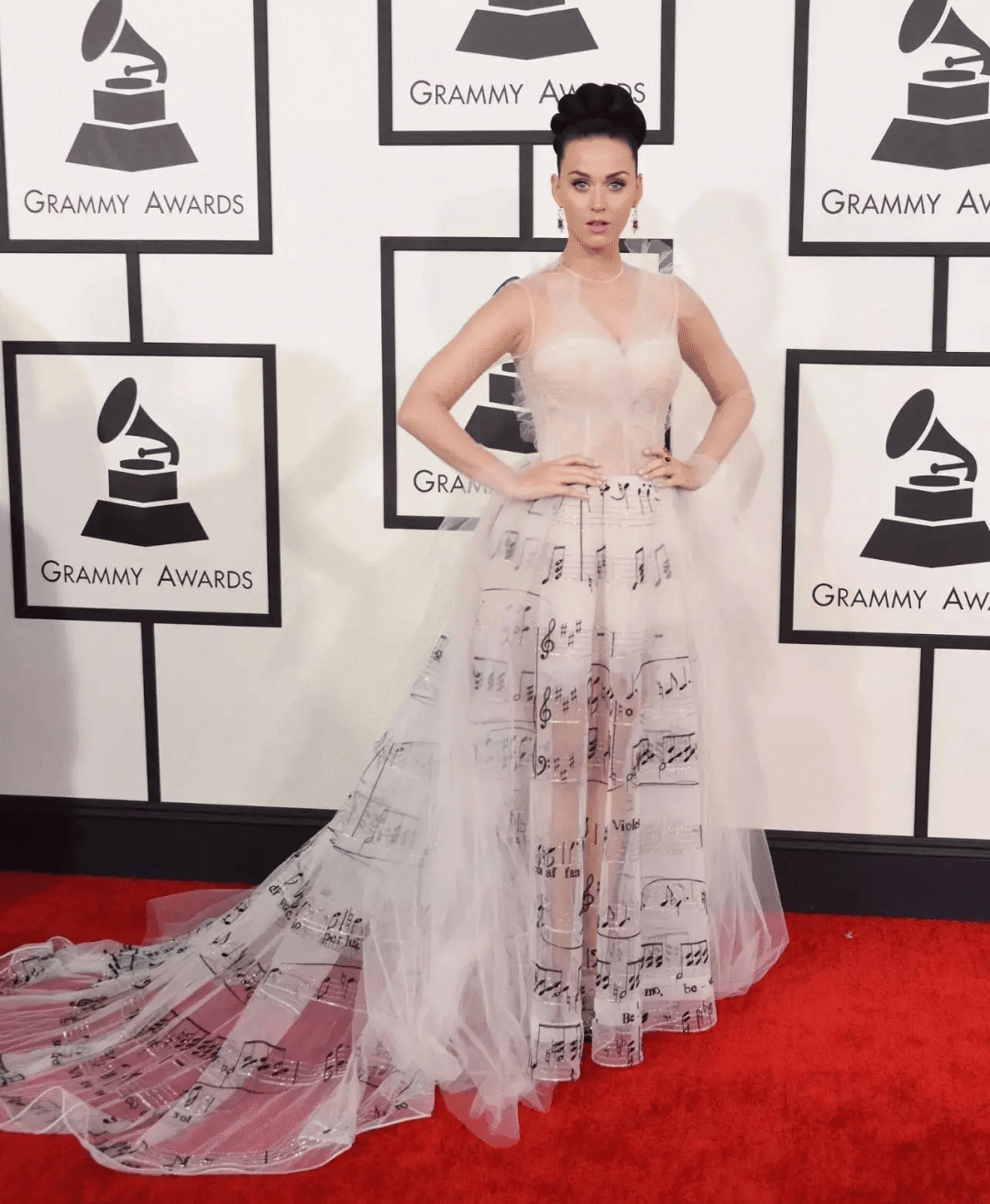 这条高定裙子发布仅仅几天后,就被水果姐穿上亮相第56届格莱美红毯,让这条高定裙和Valentino品牌都名声大噪。