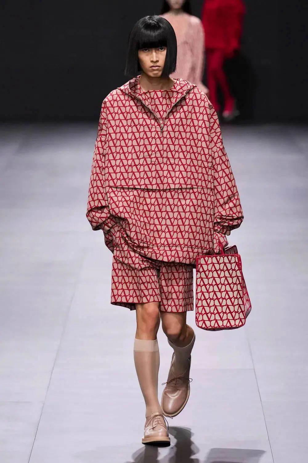 2022年10月Valentino2023春夏系列大秀上,Pierpaolo Piccioli又让更加简洁的“V字”Logo铺满全身,形成了密密麻麻、密不透气的视觉冲击力,聚焦着视觉中心,同时又充满新奇有趣感。