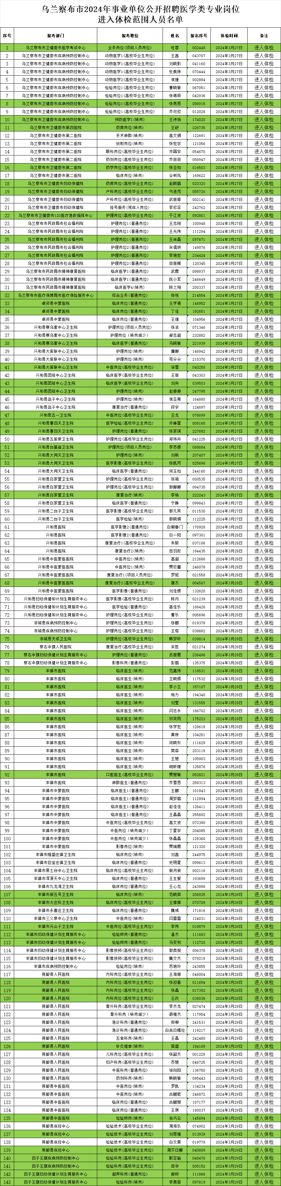 《乌兰察布市2024年事业单位公开招聘医学类专业岗位进入体检范围人员名单》