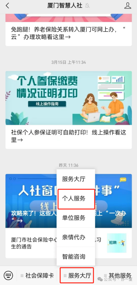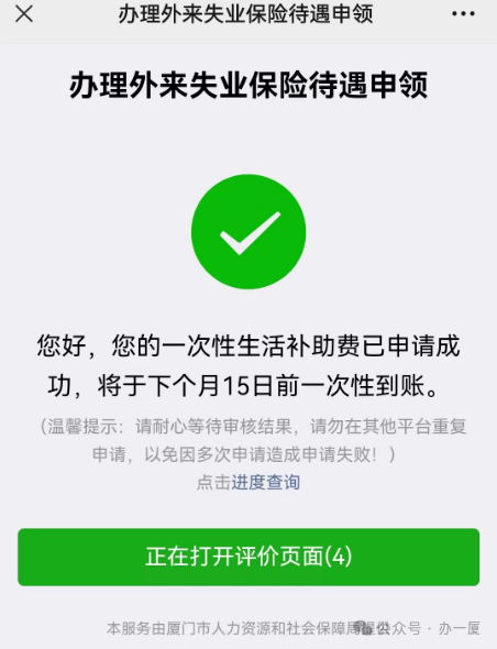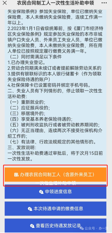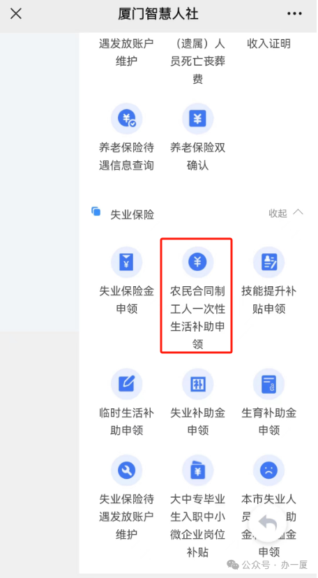 微信搜索关注公众号:厦门智慧人社-服务大厅-个人服务-社会保障-失业保险-农民合同制工人一次性生活补助-办理农民合同制工人(含原外来工)一次性生活补助申领