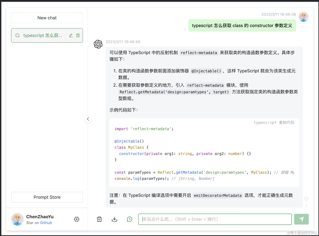所以很快发帖者就也在日常工作中使用ChatGPT来辅助他的开发;并在ChatGPT开放Api调用的第二天,开始第一次他自己部署ChatGPT服务。