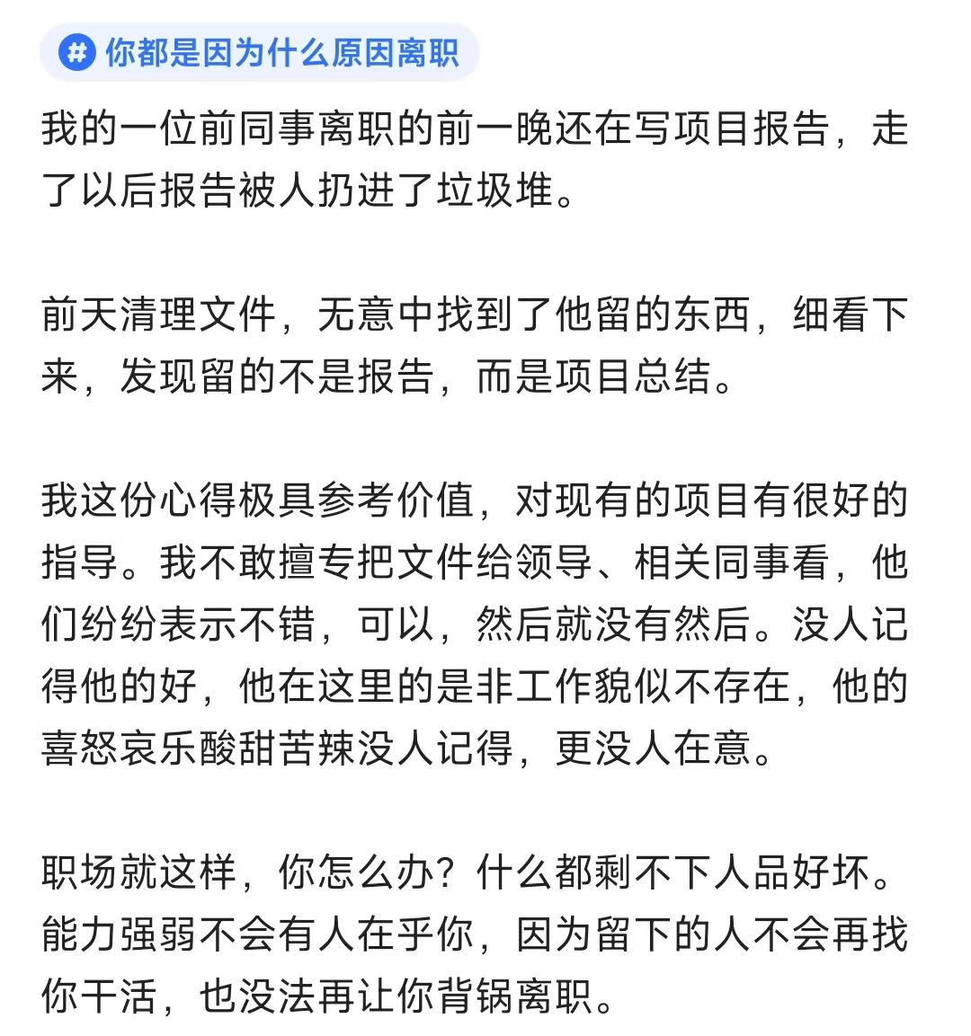 在他看来,职场就这样,没有什么人品好坏,能力强弱也不会有人在乎,留下来的人不会再找你干活,也没法让你背锅离职。