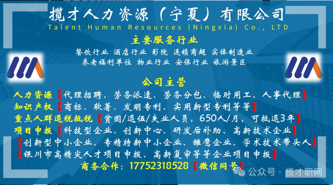 西餐厅服务员(3名 ) 1.薪资福利:薪资3300+100满勤+100考核奖金,节假日福利,免费员工餐,免费公寓式员工宿舍; 2.工作时间:8小时工作制,月休四天,环境高档,工作轻松; 3.工作内容:西餐厅客人用餐的点餐、上餐、撤台;(非中餐) 4.岗位要求:男女不限,女生35以内,男生30岁以内,形象良好,接受应届毕业生; 备注:自备黑鞋,健康证;无犯罪记录证明;1寸照片,自备被褥; 工作地点:镇北堡影视城附近 张经理15009585622【微信同号】 马经理15009588375【微信同号】