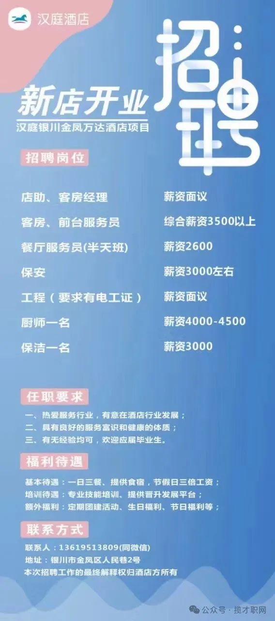 现招聘以下岗位: 1、客房服务员4名,工资3000+提成+工龄奖;综合3500+;上下班时间8:30_17:30 2、前台服务员1名,工资3500+提成+工龄奖;综合4000+;上下班时间:早班8:00_15:00;午班15:00_22_00;晚班22:00_8:00 3、餐饮服务员4名,工资3500+提成+工龄奖;综合4000+;上下班时间:14:00_结束 4、以上招聘岗位有工作经验者优先,假期工勿扰! 5、以上岗位管吃管住,提成丰厚 6、每月带薪休假4天 7、缴纳五险,每月20日工资准时发放 地址:兴庆区长城东路(银川商城附近) 联系方式:15009585622 15009588375