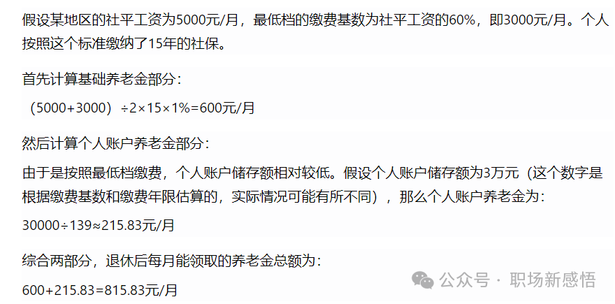 假设老李所在地区的社平工资为每月5000元,他按照“最低档”社保标准缴纳了15年。在60岁退休时,他的基础养老金部分将根据缴费年限和社平工资水平进行计算。根据公式,我们可以得出一个大致的数额。而个人账户养老金部分则取决于老李个人的缴费金额和投资收益。