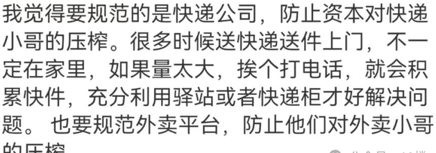 与此同时,网友们也在争论着新规的利与弊。一些人认为,快递公司应该加强管理,增加配送员数量以减轻个人工作压力。他们认为,通过提高人力投入,可以缓解快递员工作压力,提升服务质量。然而,也有一些人则主张提供更加灵活的服务选择,以满足不同消费者的需求。他们认为,通过提供加收费用的送货上门和放在驿站两种选择,可以更好地满足消费者的个性化需求。这种争论虽然看似只是对于快递行业的一种看法,但却反映出了社会对于服务行业发展的不同期待,也提醒着我们,在服务行业的发展中,如何在提供高效服务的同时,满足不同群体的需求,需要我们深入思考。
