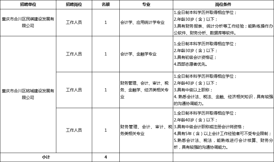 重庆市合川城市建设投资(集团)有限公司是2002年12月经合川区人民政府批准设立的国有独资公司,主要负责合川区城市基础设施建设、交通基础设施建设、保障性住房建设、土地储备整治、能源资源开发、国有资产经营、房地产开发等。公司注册资本金50亿元,主体信用评级AA+,现有员工100余人。为广泛吸纳优秀人才,加强公司员工队伍建设,现下属子公司重庆市合川区民祺建设发展有限公司、重庆市合川区铭城建设发展有限公司面向社会公开招聘4名工作人员。