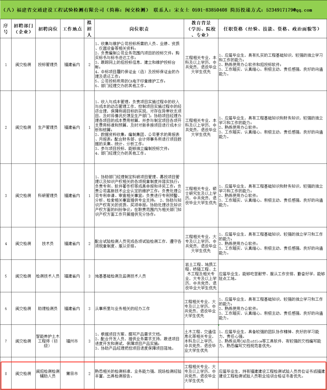 福建省招标采购集团有限公司系福建省管国有企业,是全国名列前茅、福建规模最大、实力最强的技术咨询服务公司和项目管理专业机构,也是福建省政府确定的科技项目成果对接和服务机构。现因业务发展需要,诚邀以下专业人才加盟。
