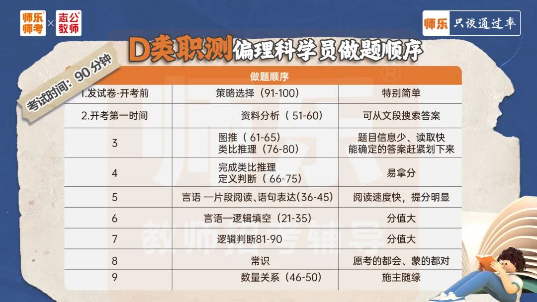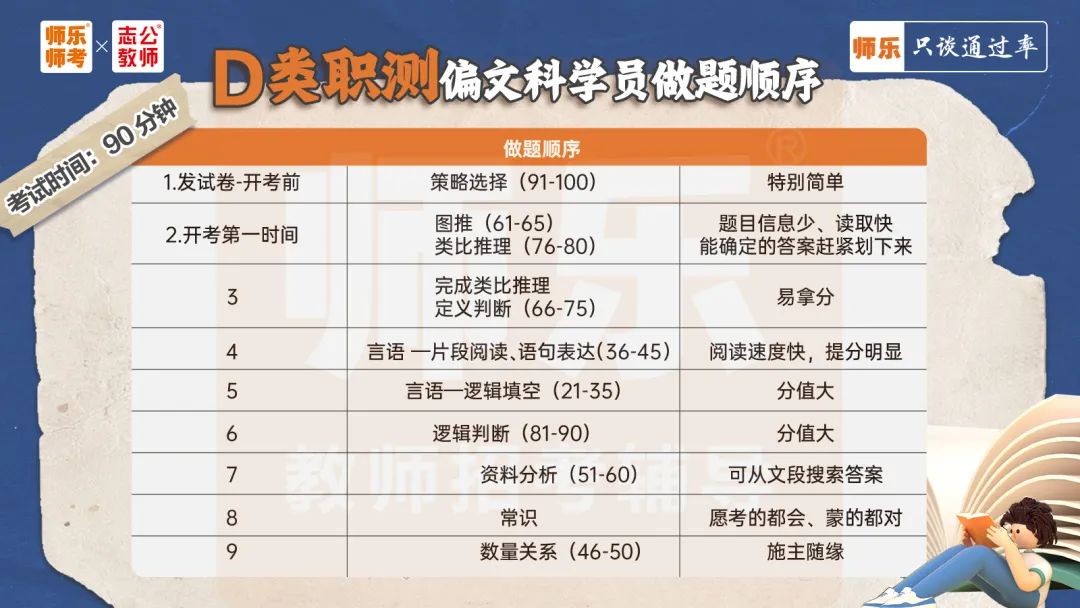 在考试中,大部分考生的时间分配是不合理的,很多人都把资料分析留在最后面完成。当监考老师在最后十五分钟提醒的时候,考生开始心慌,自乱阵脚,出现很多错误。所以资料分析这类题目千万不能放在最后做,可以试着把数量关系或其他模块放在最后做。