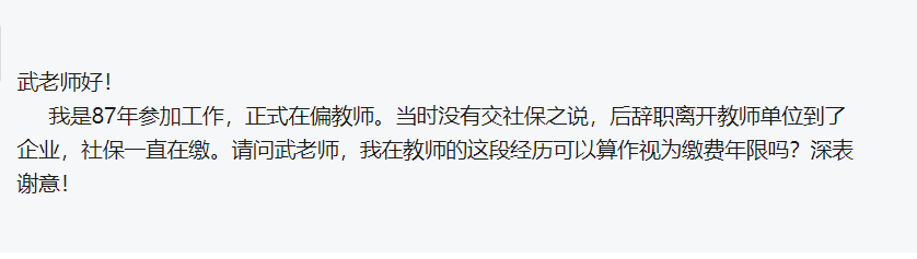 提问的读者,87年参加工作,属于养老保险制度以前,离开教师单位到了企业,社保一直在缴纳,有实际缴费年限。