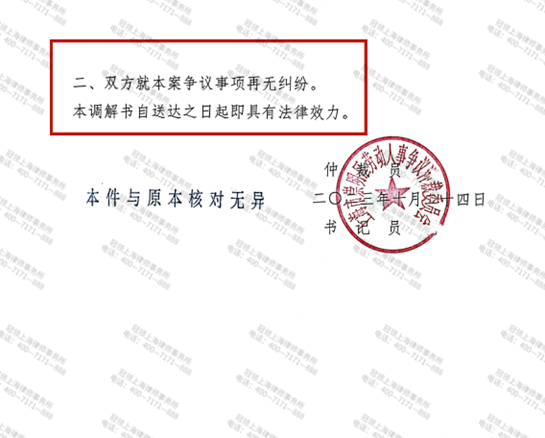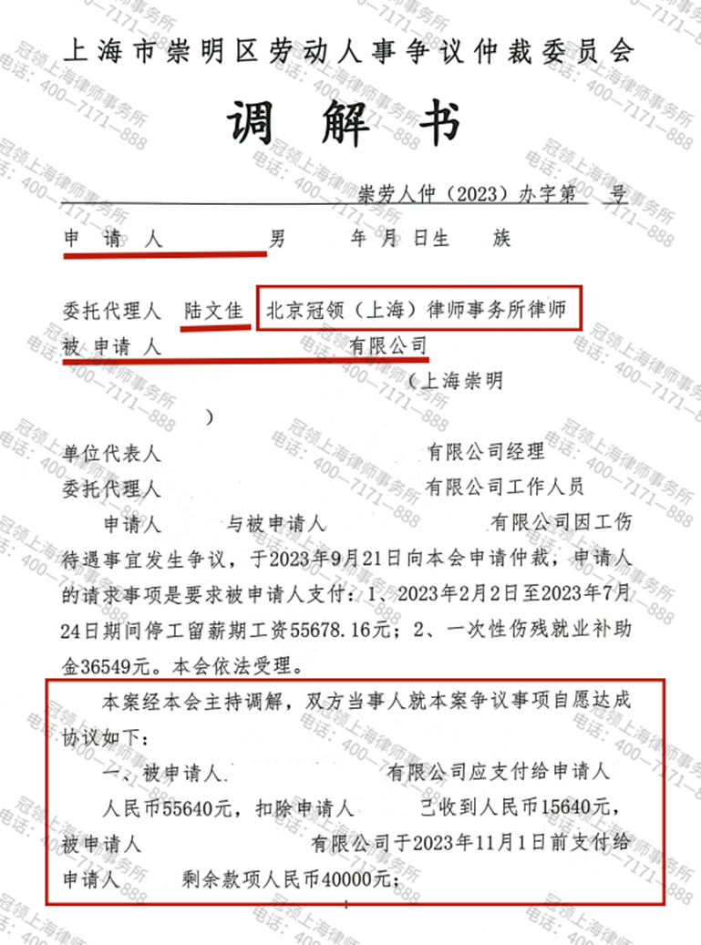 审理过程中,光明公司自觉理亏,同意调解。最终,双方在劳动人事争议仲裁委员会的主持下达成调解协议,被申请人光明公司向刘阔哲支付共计5.5万,光明公司配合刘阔哲办理工伤保险所需材料,刘阔哲对冠领律师的专业水平及案件结果非常满意!(除办案律师外,文中公司名称、人物名称均为化名)