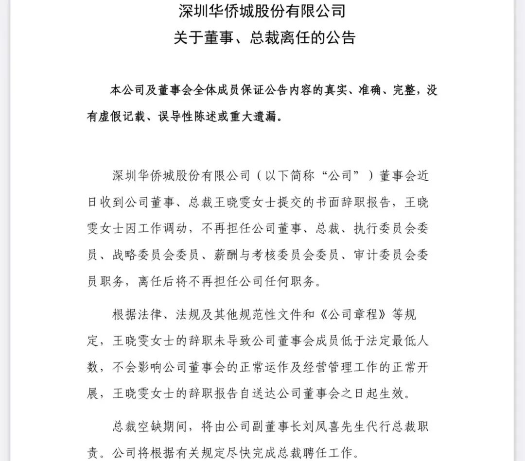 不过如今刚刚完成业绩发布会的华侨城,这就出了大事。华侨城股份官宣:原董事兼总裁王晓雯离任,目前副董事长刘凤喜代行总裁职责。