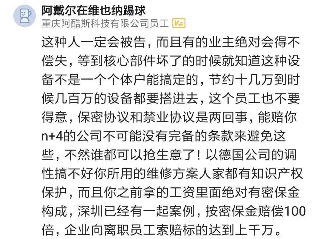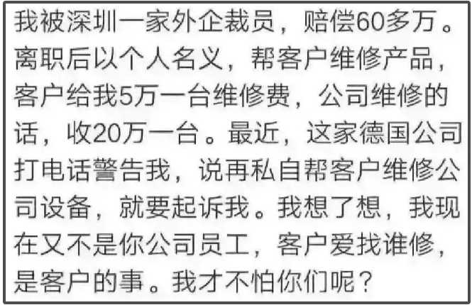 羡慕完赔偿,说点正事,拿完赔偿跟公司就没关系了,结果这哥们去服务公司的客户,给客户维修产品,公司收费20万,个人服务收5万,等于老东家的客户被抢走了,这个问题貌似是很严重的,于是公司就警告了这哥们,说要起诉。
