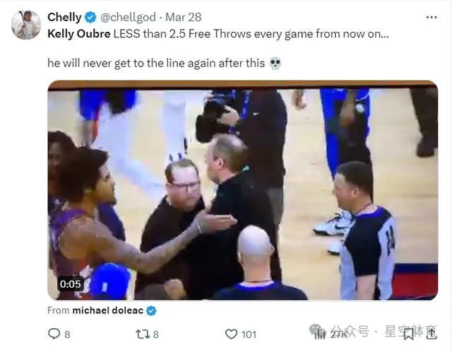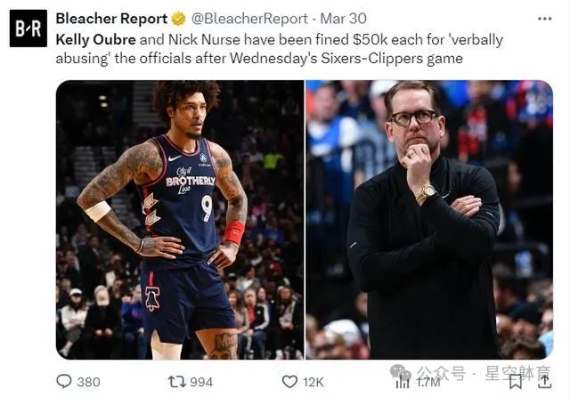 3月30日,NBA官方还因为乌布雷与纳斯辱骂裁判一人罚款5万美元。要知道乌布雷本赛季的薪水才289万,这5万美元对于他来说是一笔巨款。