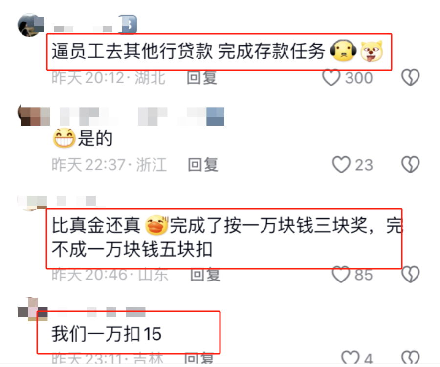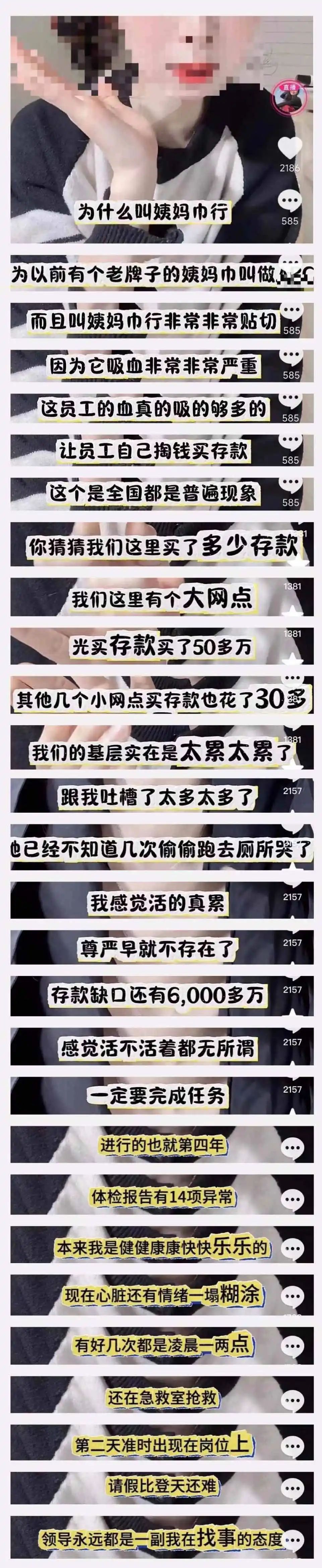 近期,一位前银行员工小姐姐在抖音平台上勇敢发声,揭露了某银行严重的“买存款”现象,瞬间激起了行业内的轩然大波。她的抖音账号迅速成为众多银行员工倾诉与吐槽的集中地,留言内容令人触目惊心。更为引人关注的是,这家银行的官方抖音账号也因此受到波及,评论区陷入混乱,最终不得不关闭评论功能。这一事件不仅揭示了这家银行的问题,更是全国多家银行普遍存在买存款、买贷款、买指标等乱象的冰山一角。在此之前,我只知道“砖行”,“大妈行” “宇宙行”这些银行的外号。然而,在浏览了网友的评论和小姐姐的视频后,银行的外号简直刷新了我的三观。“黑奴行”、“低保行”、“姨妈巾行”,新时期的银行外号在网络上迅速传播,其背后隐藏的是银行员工们不为人知的辛酸与无奈。邓行长在此申明:本文并未提及具体银行名称,请各家银行不要对号入座,以免投诉我侵权。这些留言和评论均来自网络,是银行员工们自发表达的心声,并不代表我个人的立场。我只是一个倾听者,只想传递出广大银行员工的声音。银行,这个曾经被无数人视为稳定、高收入和社会地位的代名词,如今却成为了员工们背负巨大压力的战场。存款指标的压力让他们倍感辛酸与无奈,为了完成任务,他们不得不四处奔波,甚至不惜自掏腰包“买存款”。这些留言真实反映了银行基层员工的遭遇和工作状态,让我们看到了他们背负的巨大压力。在激烈的市场竞争中,银行为了保持市场份额和业绩增长,往往会给员工设定高额的存款指标。这些指标不仅关系到员工的个人收入和职业发展,更直接关系到银行的经营状况和业绩考核。然而,随着市场竞争的加剧和客户需求的变化,拉存款的难度越来越大。银行员工们不仅要面对其他银行的竞争,还要应对客户的各种需求和疑虑。他们需要花费大量的时间和精力去与客户沟通、协商,甚至为了完成任务而不惜一切代价。更令人痛心的是,这种压力不仅影响了银行员工的生活质量,还对他们的身心健康造成了极大的威胁。长时间的工作压力和紧张情绪让他们处于高度紧张状态,容易出现焦虑、抑郁等心理问题。同时,他们还要面对客户的不满和投诉,甚至遭受同事之间的勾心斗角。这些压力让他们倍感孤独和无助,对银行的忠诚度和工作热情也逐渐消磨殆尽。面对这种困境,银行员工们普遍感到无奈和无力。他们曾经以为选择了银行这个职业就能过上稳定、舒适的生活,却没想到会面临如此巨大的压力和困境。他们渴望得到社会的理解和支持,也渴望银行能够给予他们更多的关爱和支持。当然,我们也应该看到,银行员工背负巨大存款指标压力的背后,也反映出当前金融行业存在的一些问题。过于追求业绩和市场份额,忽视了员工的身心健康和合理利益;缺乏有效的内部管理机制,导致员工压力过大、违规操作频发等等。这些问题不仅影响了银行员工的正常工作和生活,也对整个金融行业的健康发展造成了潜在的威胁。因此,银行应该重新审视自己的经营模式和发展理念,加强内部管理和员工关怀。最后,监管部门也应该加强对银行的监管力度,规范市场秩序,防止过度竞争和恶性竞争。同时,也希望大家能够了解并关心银行员工的真实处境,共同推动金融行业的健康发展。 |