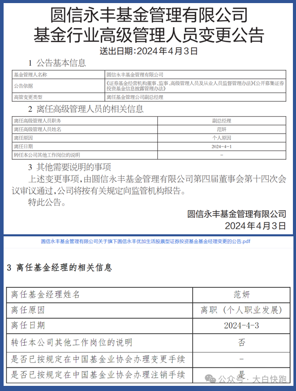 今天,圆信永丰基金发布数份公告,正式宣布范妍因离职离任所管的8只产品,并卸任公司副总经理。