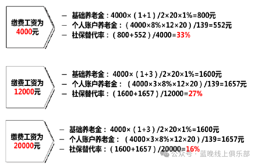 根据世界银行组织建议,要基本维持退休前的生活水平不下降, 养老替代率需不低于70%。国际劳工组织建议养老金替代率最低标准为55%。收入越高社保养老金替代率低,假设社平工资4000元,缴费20年,60岁开始领养老金, 不考虑社会平均工资及个人工资增长及个人账户利息结算, 缴费工资分别4000元、12000元、20000元时,社保替代率分别为: