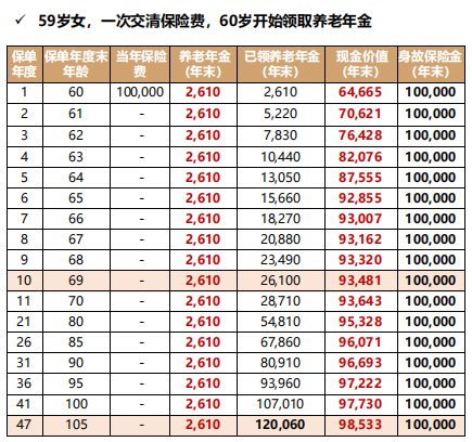 59岁女性,一次性交费10万元,60岁开始领取,每年领2610元,活多久领多久。