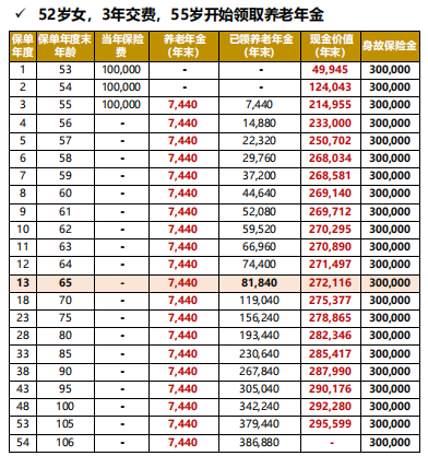 52岁女性,三年交,每年10万,55岁开始领取,每年领7440元,活多久领多久。