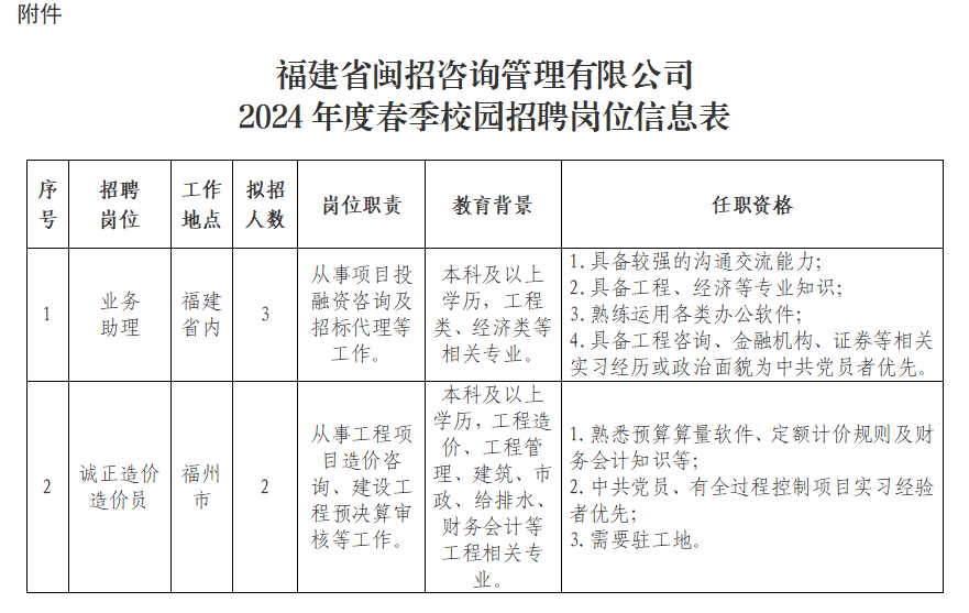 本次计划招聘的具体岗位、职位资格条件等详见《福建省闽招咨询管理有限公司2024年度春季校园招聘岗位信息表》(附件)。