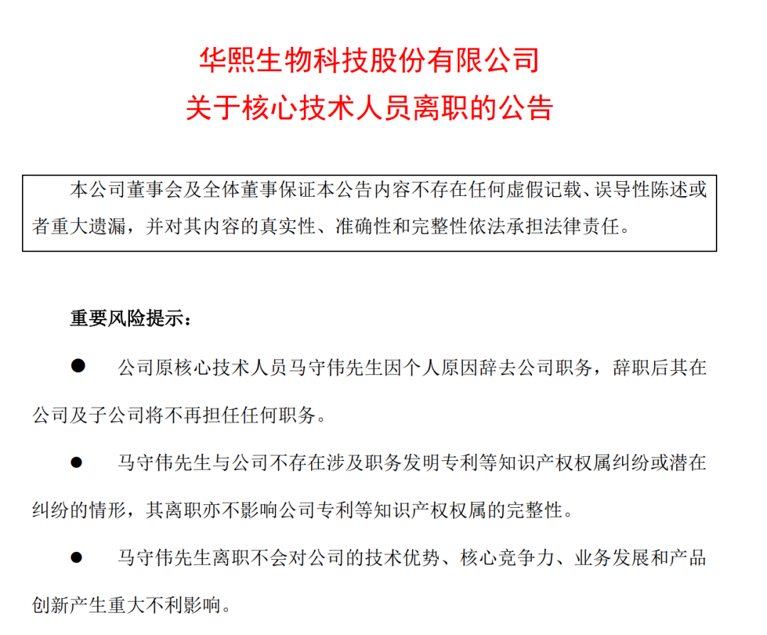 在公告中,华熙生物表示,公司已建立系统、完整的研发组织体系,可有序、高效发挥其研发职能,支撑现有业务发展。马守伟先生的离职不会对公司的技术优势、核心竞争力、业务发展和产品创新产生重大不利影响。