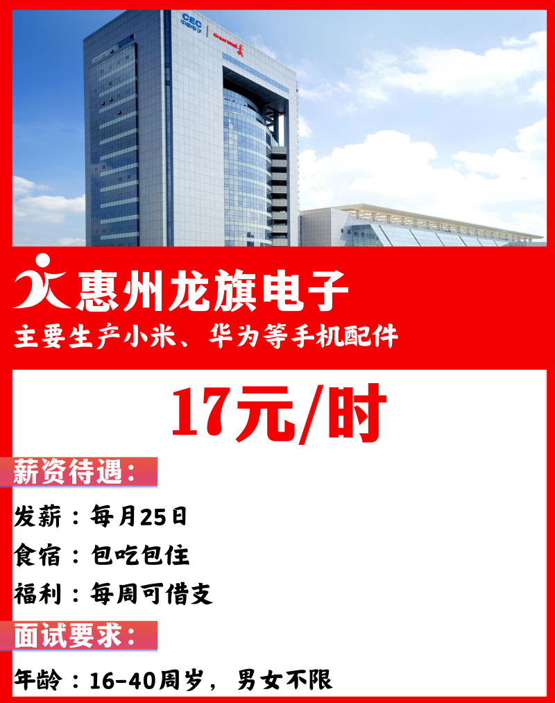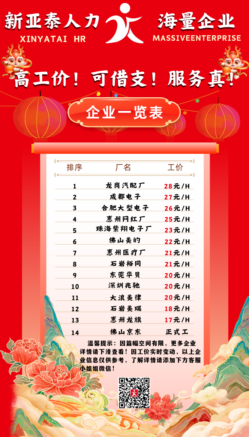 服务优势拿高工价高 信息准发薪快 借支快免费接送 言而有信报名须知1、报名一定要跟我们新亚泰工作人人员沟通清楚一切问题,不能留下疑难杂症。2、报名一定要提前准备好自己身份证原件,基本上所有的工厂都是需要身份证原件的。3、成功约面试一定要准时准点来门店线下办理入职,不要爽约哦,入职过程中任何问题及时和业务员沟通,我们将负责到底。联系我们拿高财富热线:18124582337(9.00-18.00)地址:广东省深圳市龙华汽车站邮箱:2505538860@qq.com长按扫描二维码获取更多招聘信息扫码咨询客服