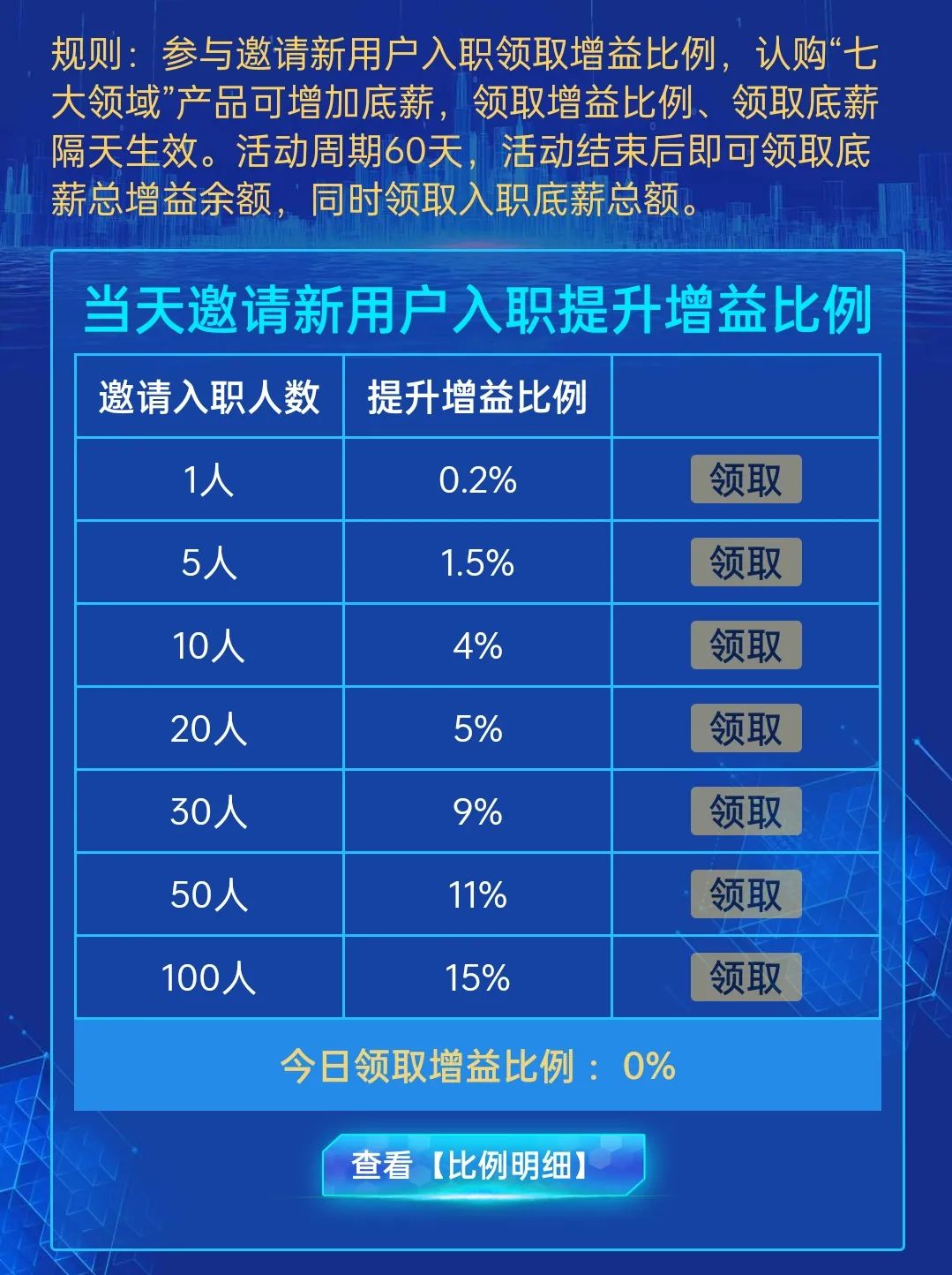 “的形式发放,每日可以获得“底薪”的增益,可通过邀请新用户入职提升每日的增益比例,