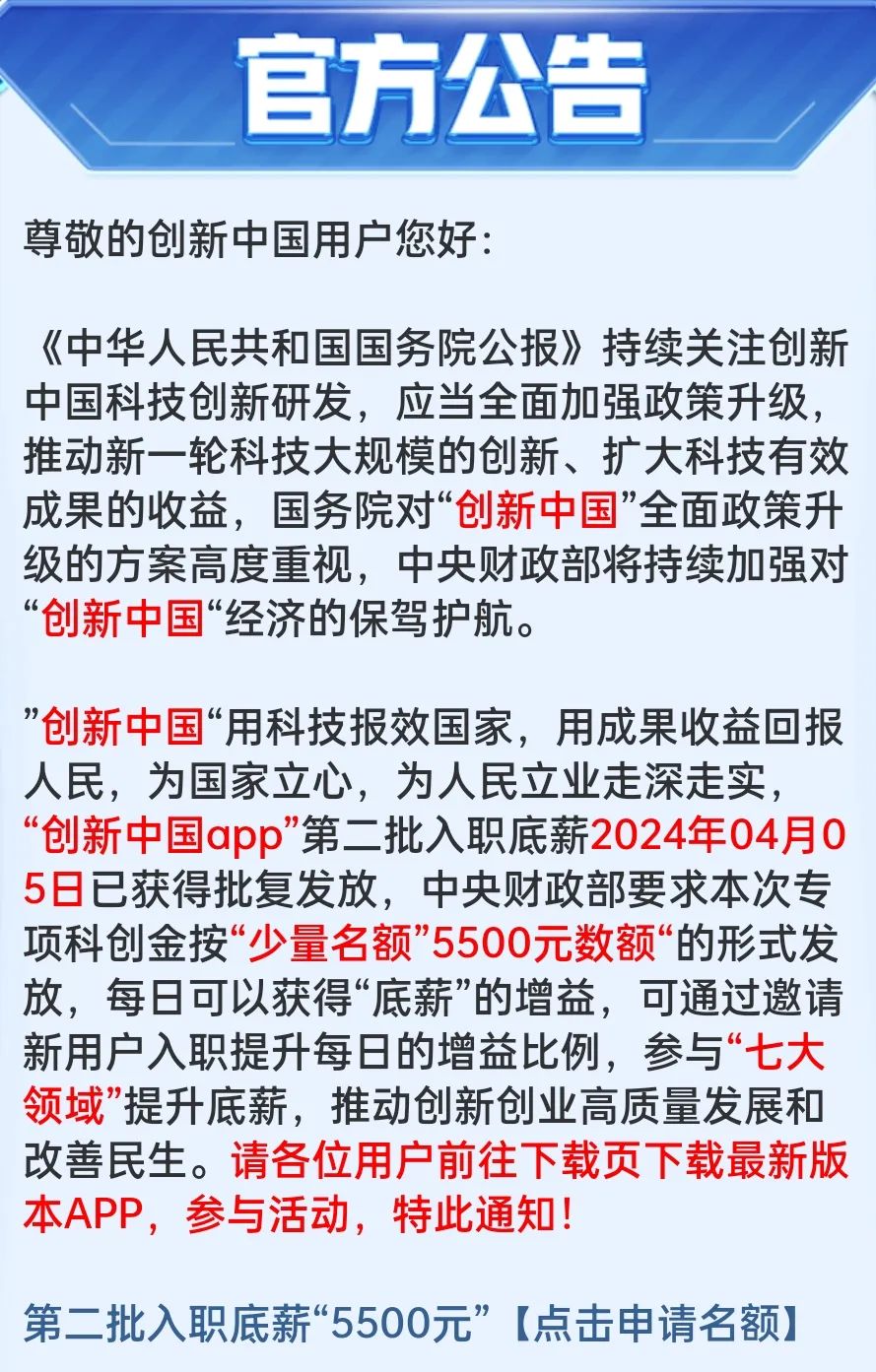 >“创新中国app” 第二批入职底薪2024年04月05日已获得批复发放