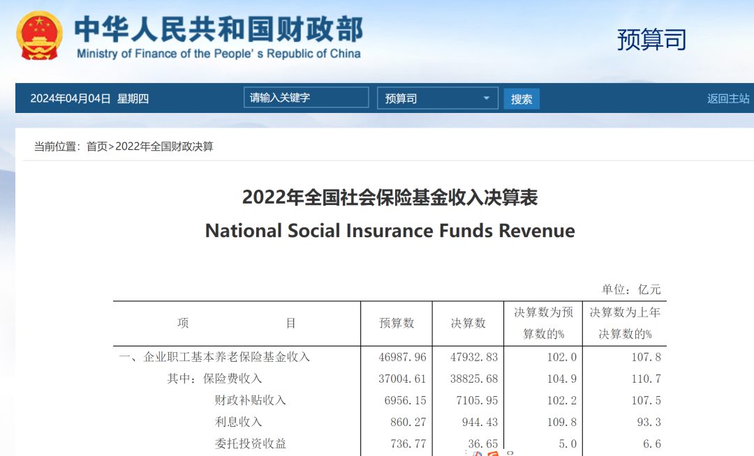 我们看看最新的,2022年全国社会保险基金收入决算表