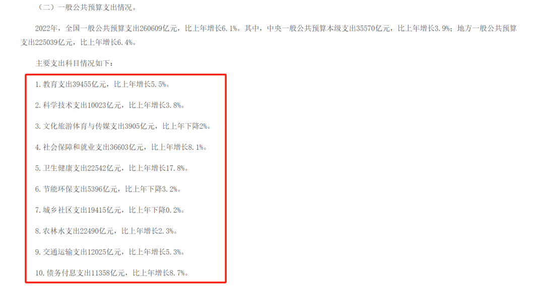 2022年的教育支出是39455亿元,科学技术支出是10023亿元,这些都是能产生中长期收益的财政支出。