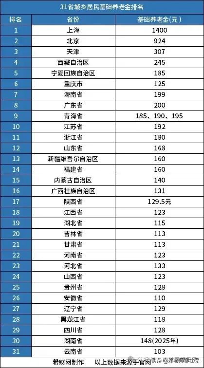 城乡居民养老金各省市的上涨金额还没有公布,最低不能低于123元,最高的是上海,去年就已经达到1400元,31省市平均水平是190元。