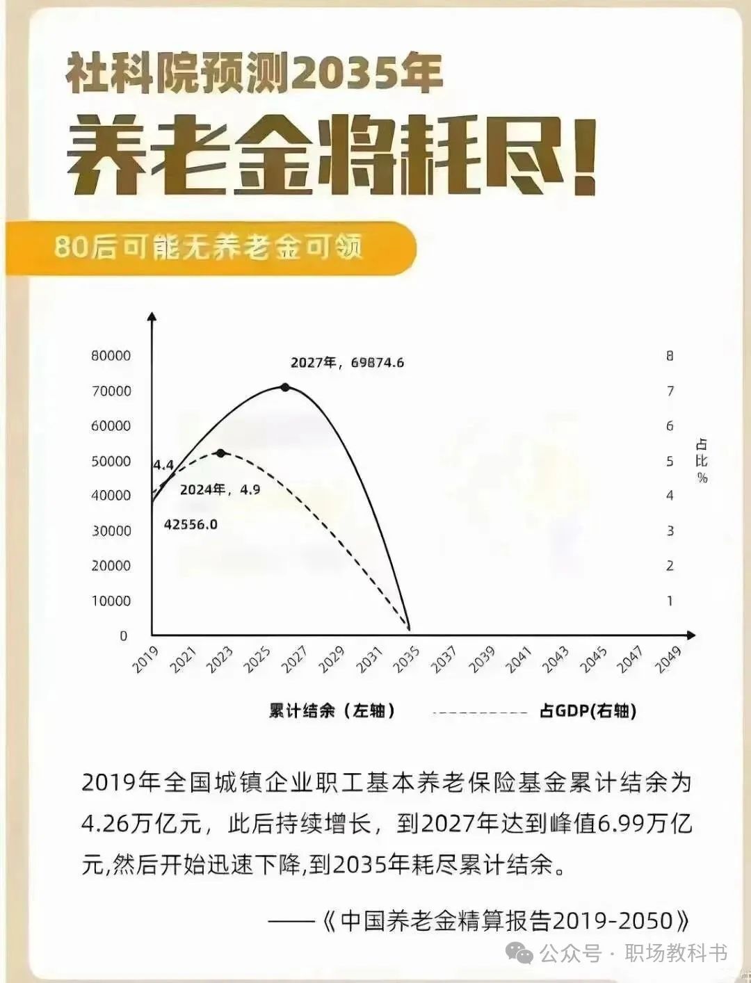 先来看看这份让人心惊胆战的报告吧。社科院发布的《中国养老金精算报告2019-2050》可是给咱们泼了一盆冷水。报告指出,2019年全国城镇企业职工基本养老保险基金累计结余还有4.26万亿元,看上去还挺多的,对吧?但别急,这只是一个开始。报告预测,这个结余会持续增长到2027年的峰值6.99万亿元,然后就开始走下坡路了,一路下滑,直到2035年耗尽累计结余。这速度,简直比过山车还刺激啊!