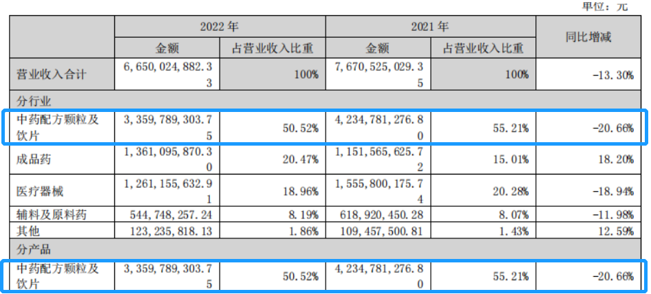 其中,红日药业的中药配方颗粒及饮片收入下降较为明显,2022年该项收入为33.6亿元,同比下降20.66%;2023年该项收入为29.23亿元,同比下降12.99%。