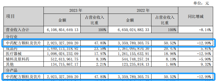 中药配方颗粒及饮片是红日药业的最大收入来源,2023年营收占比为47.85%,撑起了业绩的“半边天”。