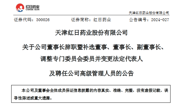 4月1日,红日药业发布公告,姚小青因个人原因申请辞去红日药业法定代表人、董事长、董事及董事会专门委员会中的相关职务,辞职后不再担任红日药业任何职务。